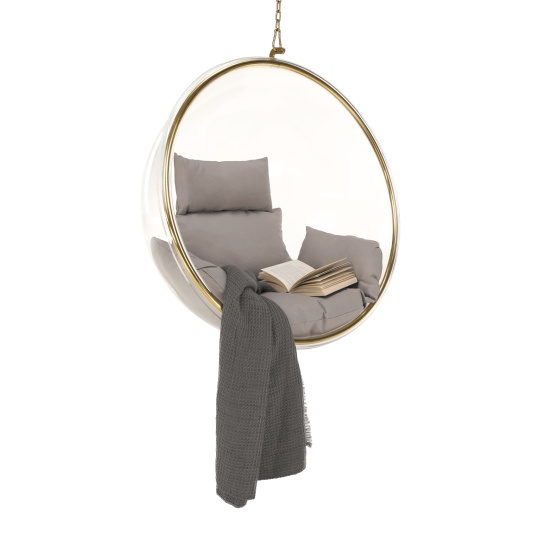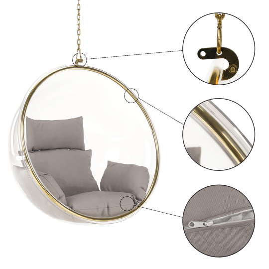 Závěsné křeslo BUBBLE NEW TYP 1 Materiál: nerezová ocel/ akryl/látka Oděruodolnost textilie podle testu Martindale: 95 000 oděrů Barva rámu: zlatá Barva akrylu: transparentní Barva polštáře: šedá Rozměry křesla (ŠxHxV): 106x62x106 cm Vnitřní průměr: 97 cm Hloubka sezení: 60 cm Délka řetízku: 200 cm Maximální nosnost: do 100 kg Vhodné do interiéru i exteriéru Dodáváno s polštářem Polštáře jsou voděodolné Se zipem na spodní straně polštáře Dodáváno v monte