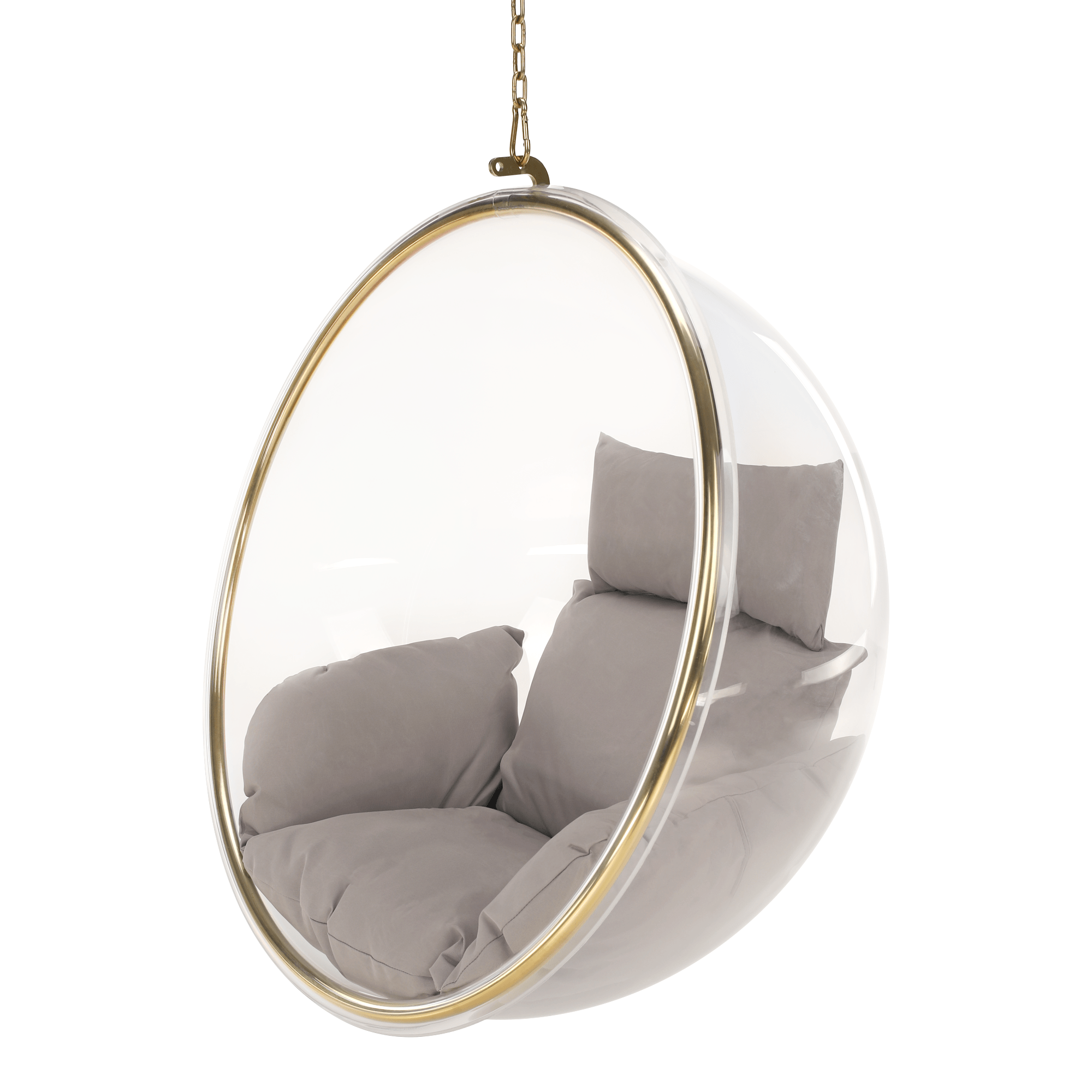 Závěsné křeslo BUBBLE NEW TYP 1 Materiál: nerezová ocel/ akryl/látka Oděruodolnost textilie podle testu Martindale: 95 000 oděrů Barva rámu: zlatá Barva akrylu: transparentní Barva polštáře: šedá Rozměry křesla (ŠxHxV): 106x62x106 cm Vnitřní průměr: 97 cm Hloubka sezení: 60 cm Délka řetízku: 200 cm Maximální nosnost: do 100 kg Vhodné do interiéru i exteriéru Dodáváno s polštářem Polštáře jsou voděodolné Se zipem na spodní straně polštáře Dodáváno v monte