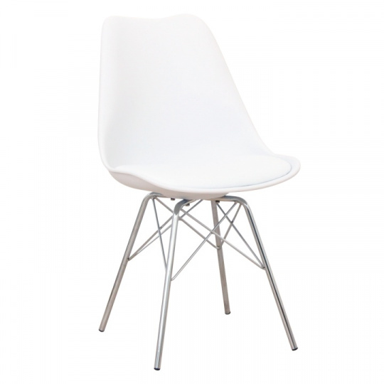 Designová židle s extra měkkým sedadlem. Materiál: ekokůže/plast/kov Oděruodolnost textilie podle testu Martindale: 100 000 oděrek Barva: bílá / chromovaná Rozměry (ŠxHxV): 48x57x85 cm Výška sezení: 49 cm Hloubka sedu: 43 cm Nosnost: 110 kg Dodávané v demontu.