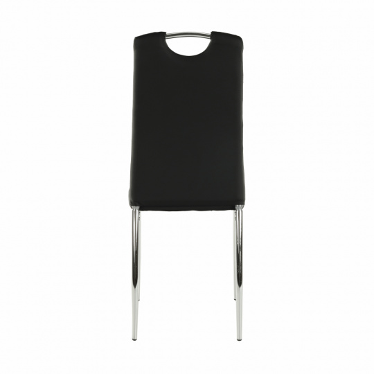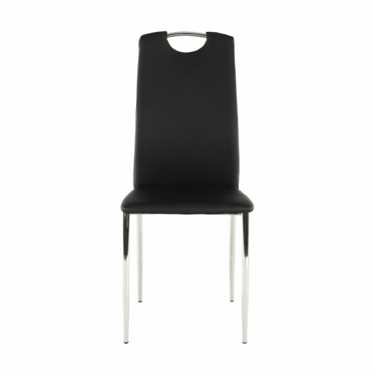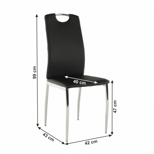 Jídelní židle ERVINA Materiál: ekokůže / chrom Oděruodolnost textilie podle testu Martindale: 100 000 oděrek Barva: černá Rozměry (ŠxHxV): 42x43x99 cm Výška sedu: 47 cm Hloubka sedu: 40 cm Nosnost: 110 kg Dodávané v demontu.
