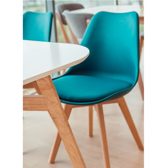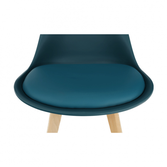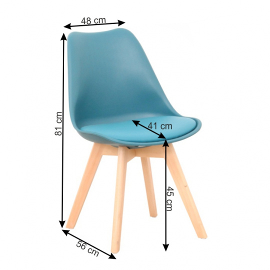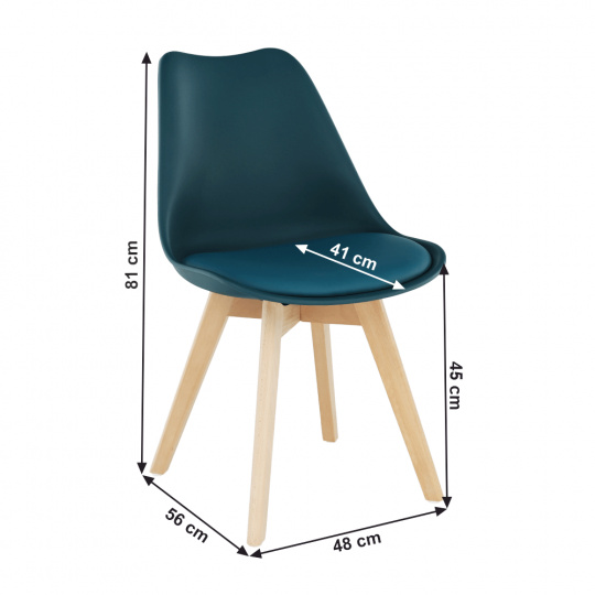 Materiál: dřevo / plast / ekokůže Oděruodolnost textilie podle testu Martindale: 100 000 oděrek Barva: buk / petrolejová Rozměry (ŠxHxV): 48x54x80 cm Výška sedu: 46 cm Hloubka sedu: 42 cm Extra měkké sezení Nosnost: 110 kg Dodávané v demontu