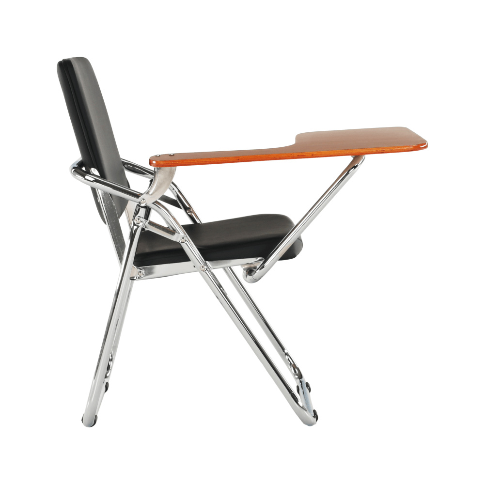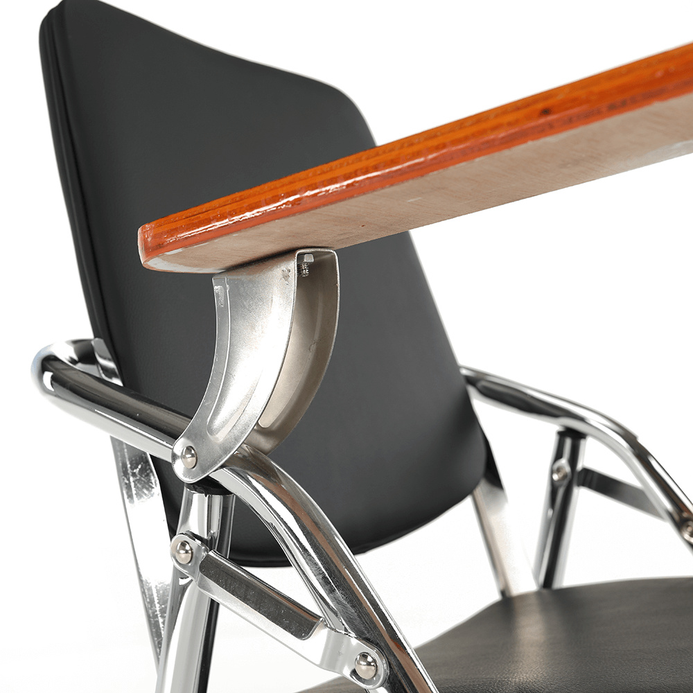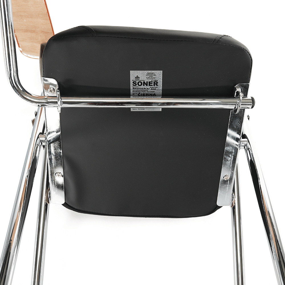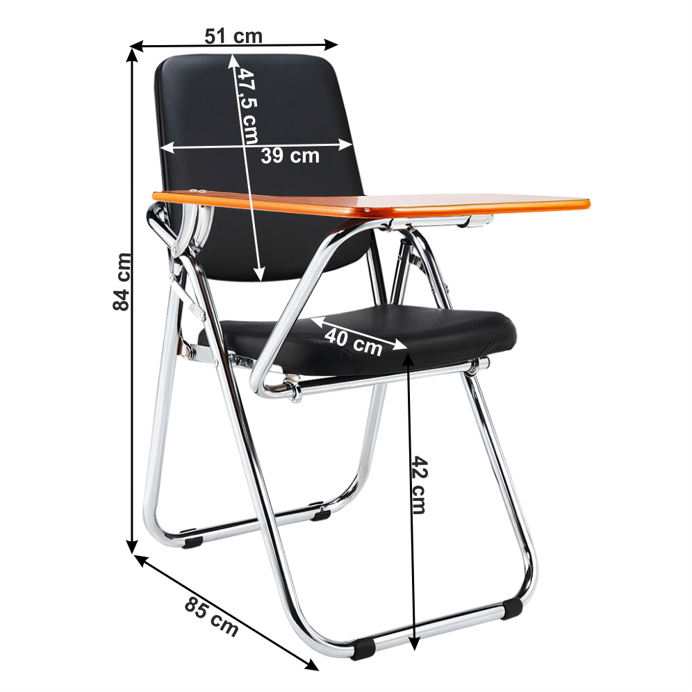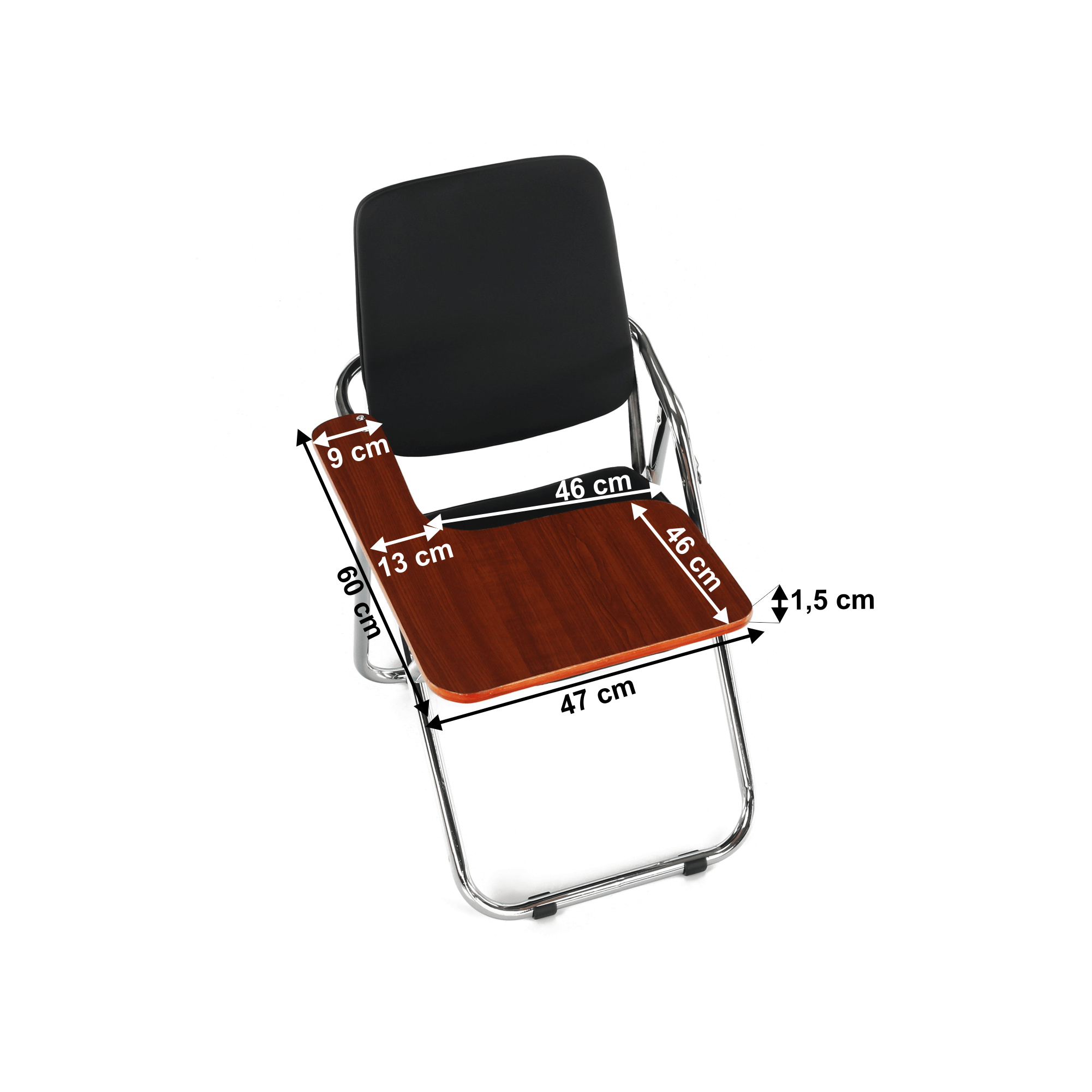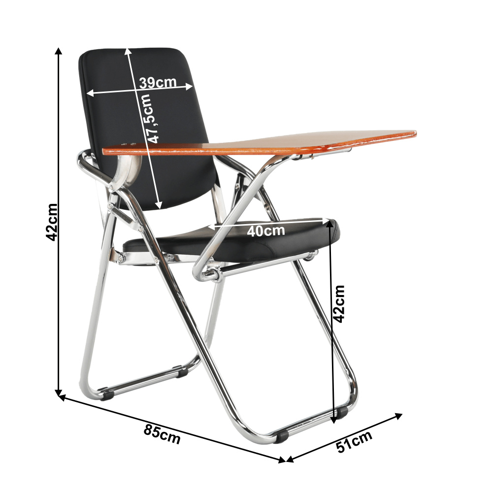 Zasedací židle s deskou na psaní SONER Materiál: ekokůže / dřevo / kov Oděruodolnost textilie podle testu Martindale: 100 000 oděrek Barva: černá / přírodní / chrom Rozměry (ŠxHxV): 51x85x84 cm Šířka sedu: 39 cm Výška sedu: 42 cm Hloubka sedu: 40 cm Zádová opěrka (ŠxV): 37x46,5 cm Rozměry desky (ŠxH): 38,5x27,5 cm Tloušťka desky: 1,5 cm Nosnost: 110 kg
