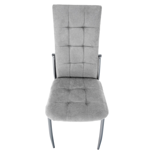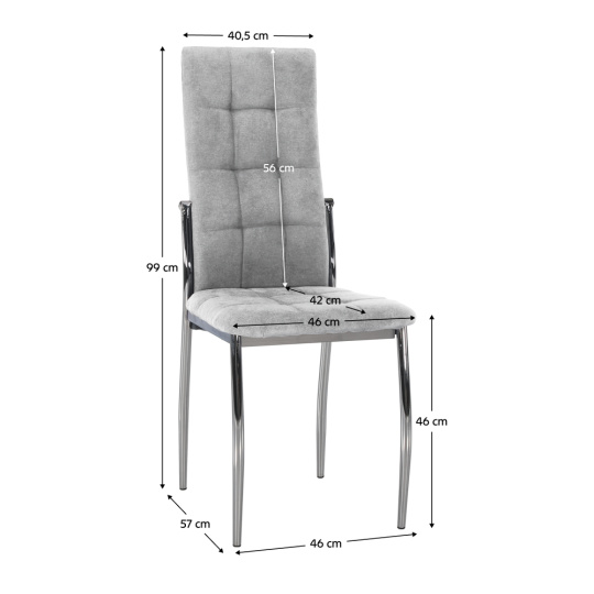 Materiál čalounění: látka Oděruodolnost textilie podle testu Martindale: 50 000 oděrů Barva: šedá Materiál nohy: kov Barva: chrom Rozměry (ŠxHxV): 46x56x99 cm Výška sedu : 47 cm Hloubka sedu: 42 cm Šířka sedu: 46 cm Výška zádové opěrky: 56 cm Šířka zádové opěrky: 36 cm Maximální nosnost: 100 kg Hmotnost: 5,1 kg Prošívaná Vhodné do jídelny Dodáváno v demontu