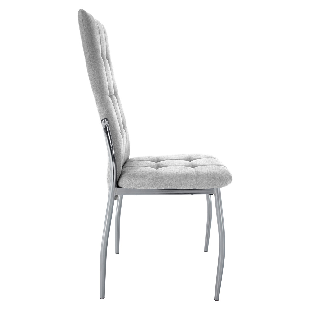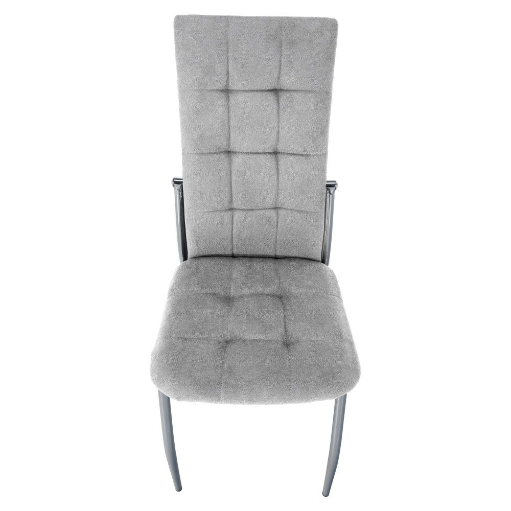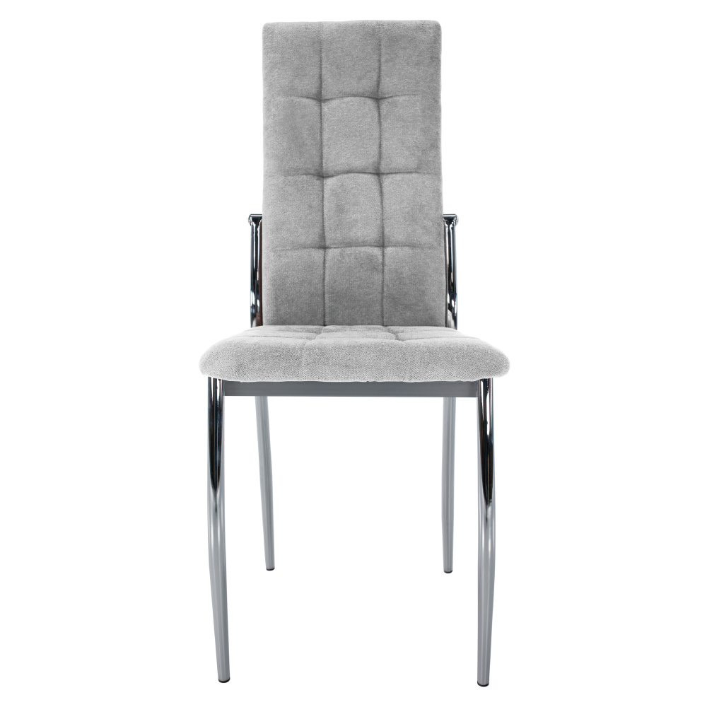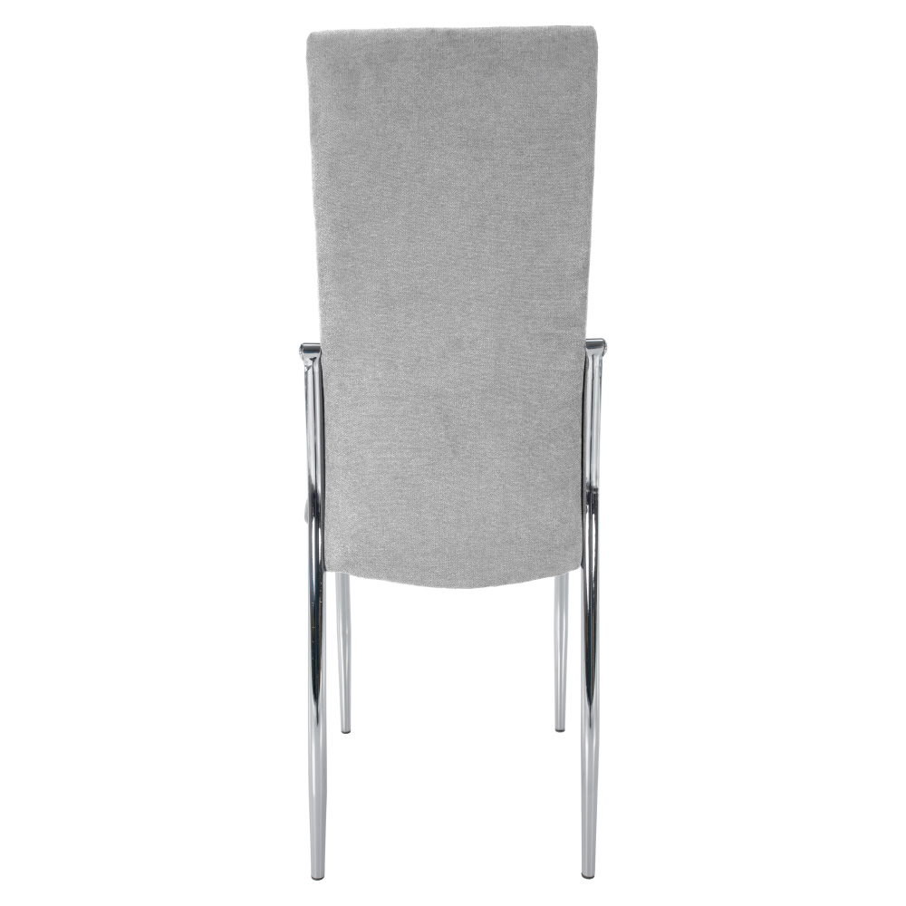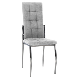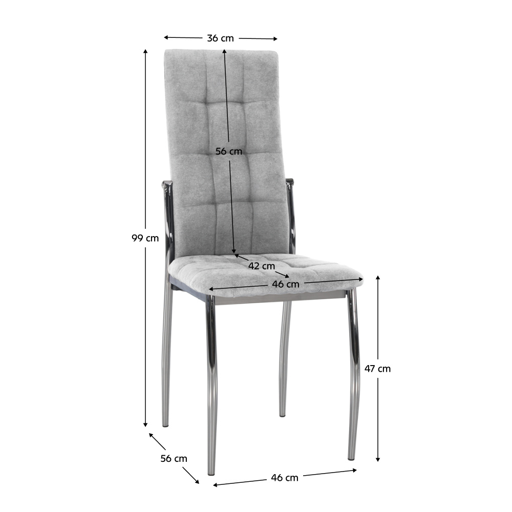 Materiál čalounění: látka Oděruodolnost textilie podle testu Martindale: 50 000 oděrů Barva: šedá Materiál nohy: kov Barva: chrom Rozměry (ŠxHxV): 46x56x99 cm Výška sedu : 47 cm Hloubka sedu: 42 cm Šířka sedu: 46 cm Výška zádové opěrky: 56 cm Šířka zádové opěrky: 36 cm Maximální nosnost: 100 kg Hmotnost: 5,1 kg Prošívaná Vhodné do jídelny Dodáváno v demontu