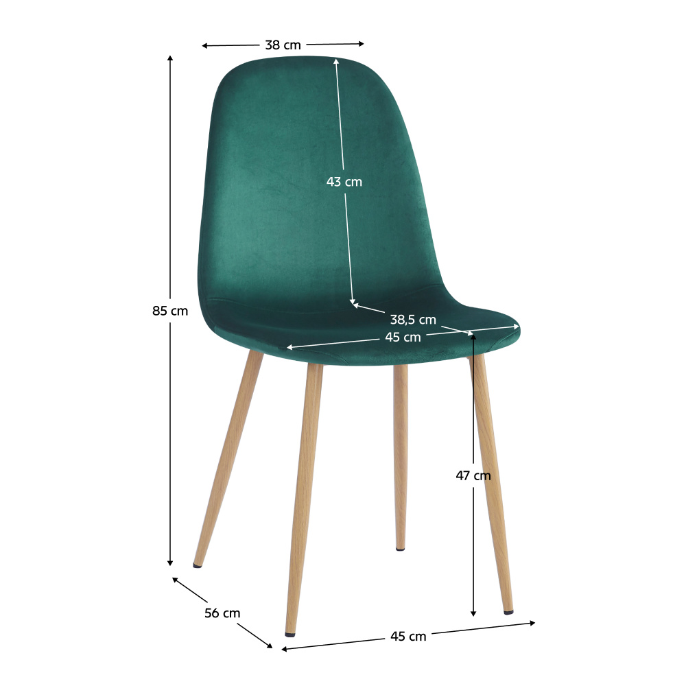 Materiál: látka/kov Oděruodolnost textilie Velvet podle testu Martindale: 85 000 oděrů Oděruodolnost textilie podle testu Martindale: 68 000 oděrů Barva: smaragdová/buk Rozměry (ŠxHxV): 45x56x85 cm Výška sedu: 47 cm Hloubka sedu: 38,5 cm Šířka sedu: 45 cm Výška zad: 43 cm Šířka zad: 38 cm Nosnost: 110 kg Dodáváno v demontu