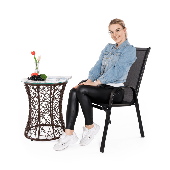 Příruční stolek vhodný k zahradnímu setu: Materiál: tvrzené sklo/ocel Barva: čirá/černá Rozměry (průměrxV): 50x46 cm Ocelová konstrukce Stabilitu vytvářejí tři nohy Kalené sklo Moderní styl Zahradní Vhodný na terasu, lodžii, zahradu Dodáváno v demontu Hmotnost: 4kg