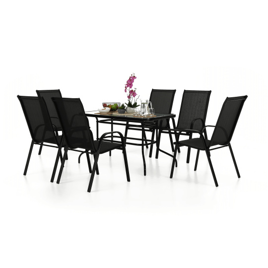 Jídelní stůl Paster vhodný k zahradnímu setu Materiál: tvrzené sklo / černá ocel Rozměry (ŠxHxV): 150x90x70 cm Stůl je předpřipravených na osazení slunečníku Pro šest osob Dodávané v demontu. Hmotnost: 26kg