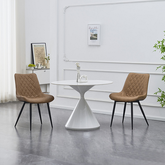 Materiál: ekokůže/kov Oděruodolnost ekokůže podle testu Martindale: 80 000 oděrů Barva: světle hnědá/černá Rozměry (ŠxHxV): 53x48x87 cm Výška sedu: 45 cm Hloubka sedu: 45 cm Šířka sedu: 53 cm Šířka zádové opěrky: 48 cm Výška zádové opěrky: 42 cm Nosnost: 100 kg Kovová konstrukce Designová Dekorativní prošívání Dodáváno v demontu