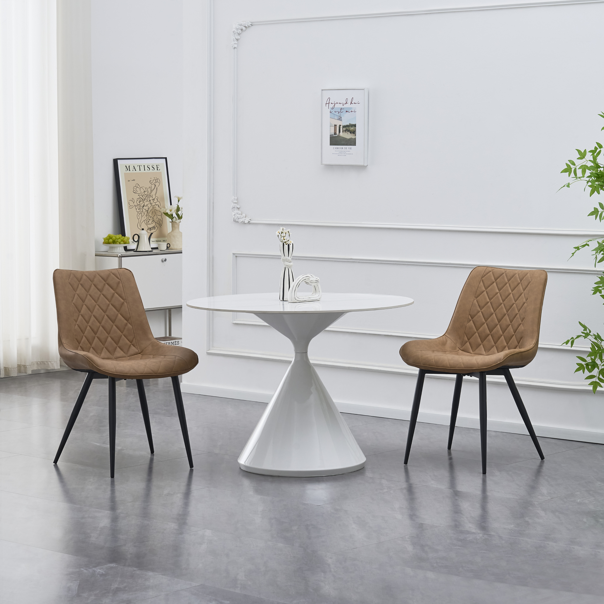 Materiál: ekokůže/kov Oděruodolnost ekokůže podle testu Martindale: 80 000 oděrů Barva: světle hnědá/černá Rozměry (ŠxHxV): 53x48x87 cm Výška sedu: 45 cm Hloubka sedu: 45 cm Šířka sedu: 53 cm Šířka zádové opěrky: 48 cm Výška zádové opěrky: 42 cm Nosnost: 100 kg Kovová konstrukce Designová Dekorativní prošívání Dodáváno v demontu