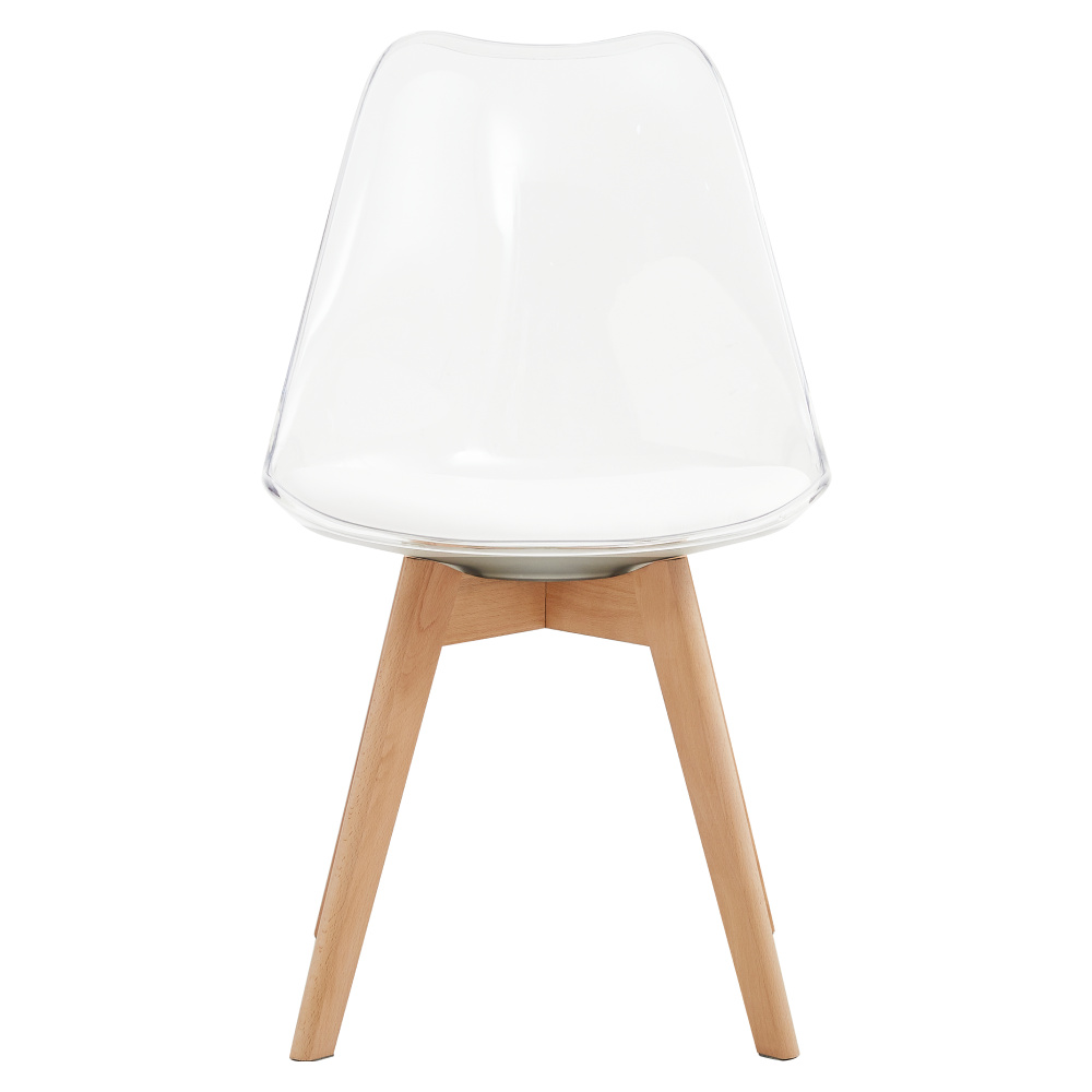 Materiál: akryl/ekokůže/bukové dřevo Oděruodolnost textilie podle testu Martindale: 100 000 oděrů Barva: transparentní/bíla/buk Rozměry (ŠxHxV): 48x54x80 cm Výška sedu: 46 cm Hloubka sedu: 42 cm Extra měkké sezení Akrylové provedení Nosnost: 110 kg Dodáváno v demontu
