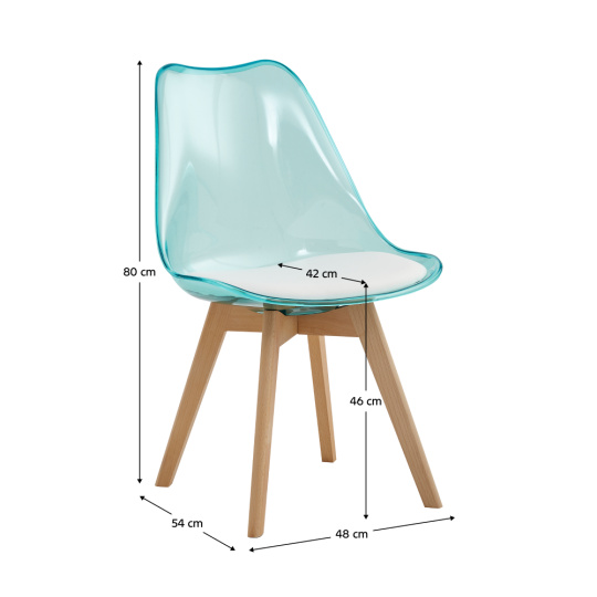 Materiál: akryl/ekokůže/bukové dřevo Oděruodolnost textilie podle testu Martindale: 100 000 oděrů Barva: transparentní zelená/bílá/buk Rozměry (ŠxHxV): 48x54x80 cm Výška sedu: 46 cm Hloubka sedu: 42 cm Extra měkké sezení Akrylové provedení Nosnost: 110 kg Dodáváno v demontu