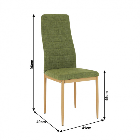 Jídelní židle COLETA NOVA v barevném provedení zelená látka / kovové nohy v provedení buk. Oděruodolnost textilie podle testu Martindale: 50 000 oděrek Rozměry (ŠxHxV): 41x49x96 cm Výška sedu: 45 cm Hloubka sedu: 39 cm Nosnost: 90 kg Dodávané v demontu.