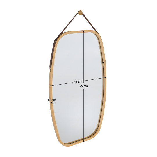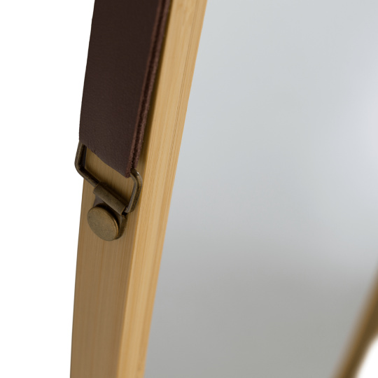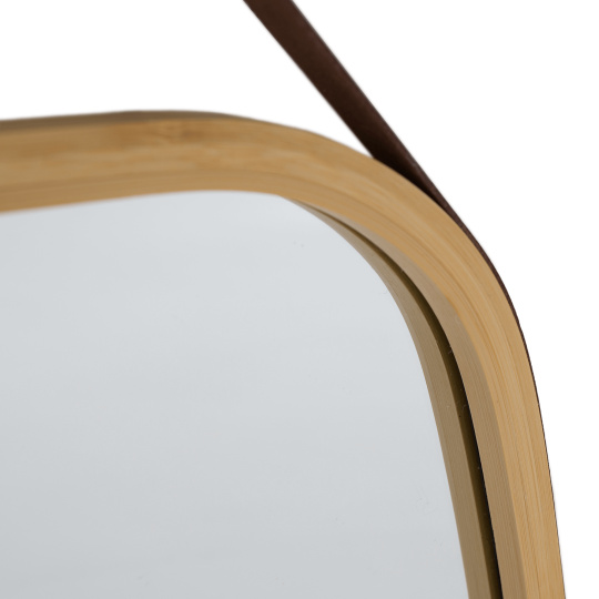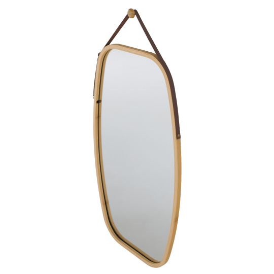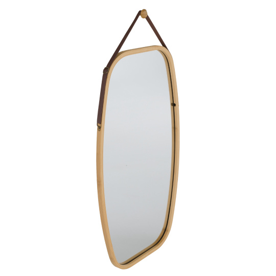 Jednoduché zrcadlo s bambusovým rámem LEMI 3 Materiál: lakovaný bambus / sklo Barva: přírodní Rozměry zrcadla (ŠxHxV): 43x1,5x76 cm Tloušťka skla: 3 mm Dodávaná s dřevěným háčkem. Zavěšení zrcadla: úchytka z hnědé ekokůže Dodávané v monte.