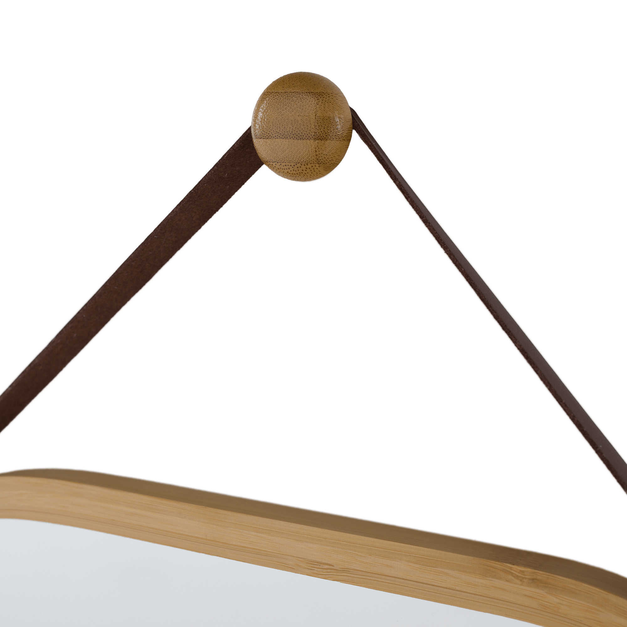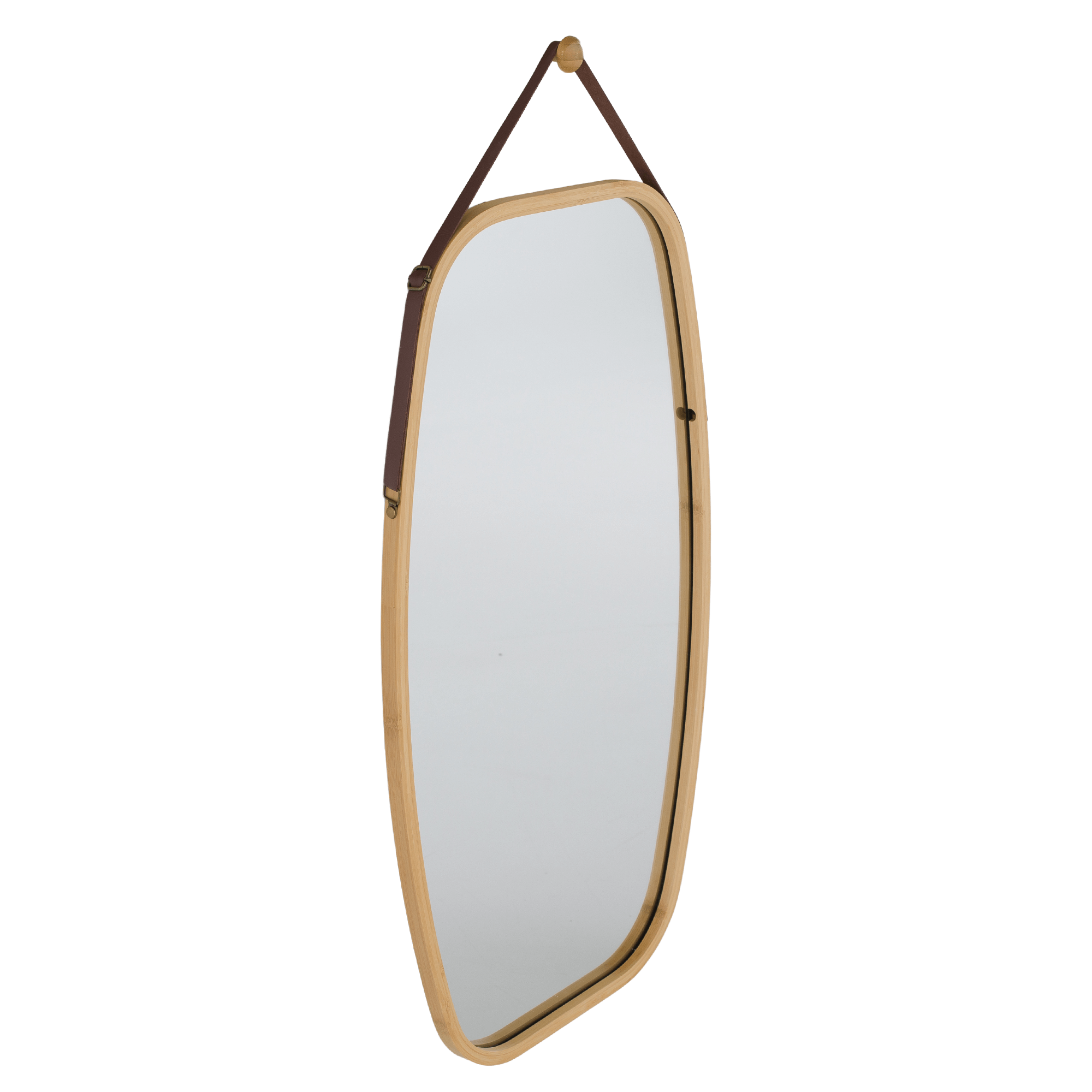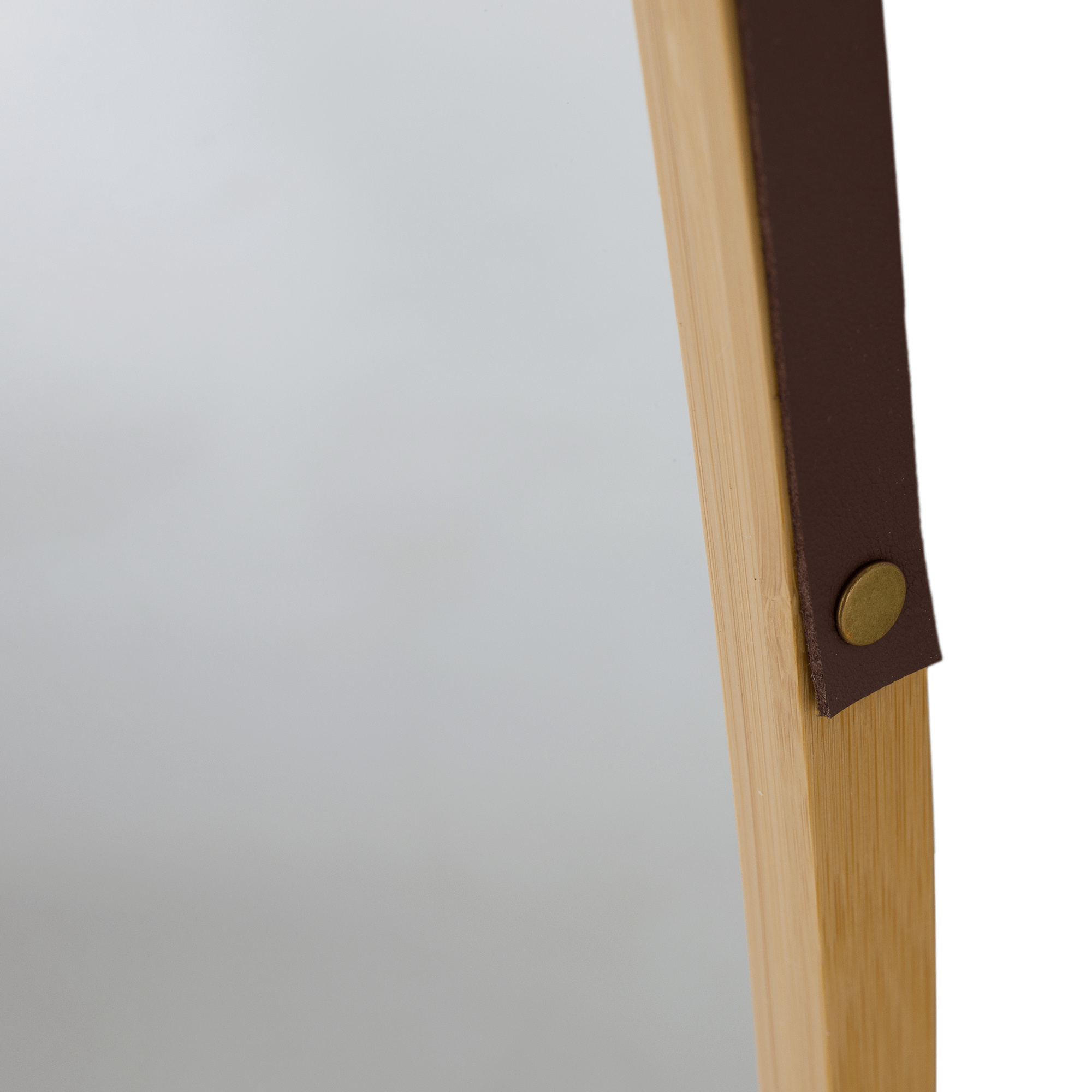 Jednoduché zrcadlo s bambusovým rámem LEMI 3 Materiál: lakovaný bambus / sklo Barva: přírodní Rozměry zrcadla (ŠxHxV): 43x1,5x76 cm Tloušťka skla: 3 mm Dodávaná s dřevěným háčkem. Zavěšení zrcadla: úchytka z hnědé ekokůže Dodávané v monte.
