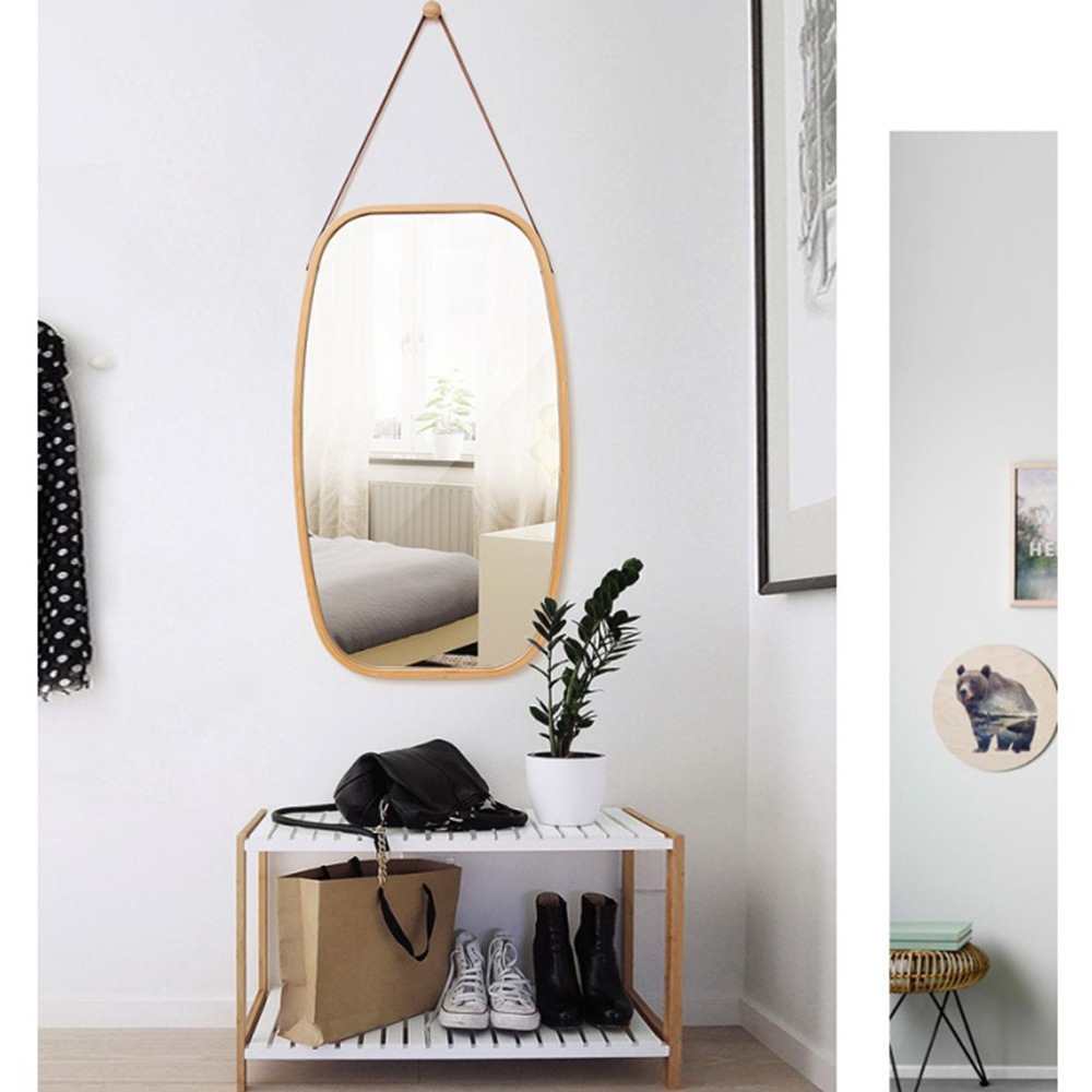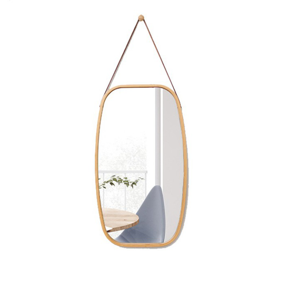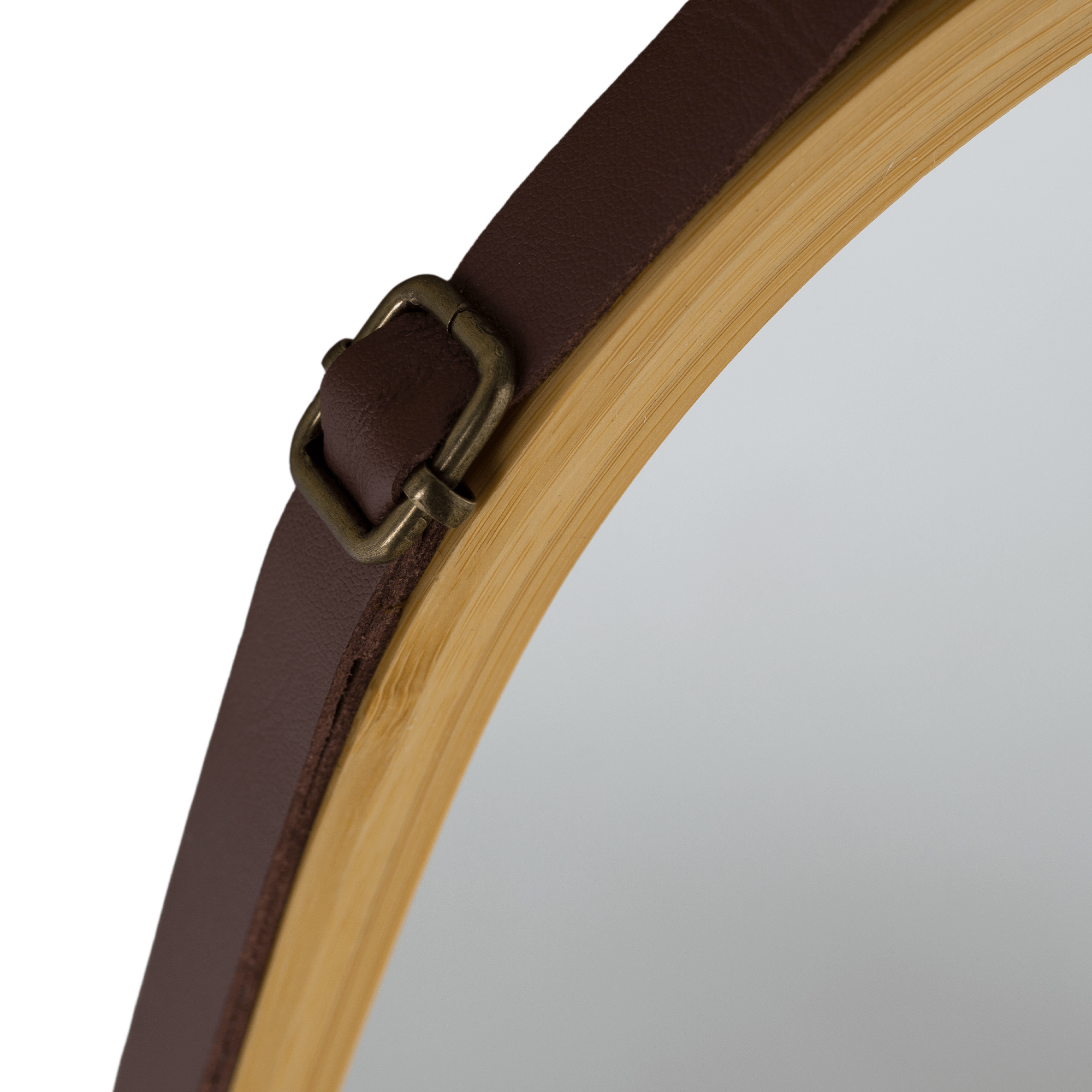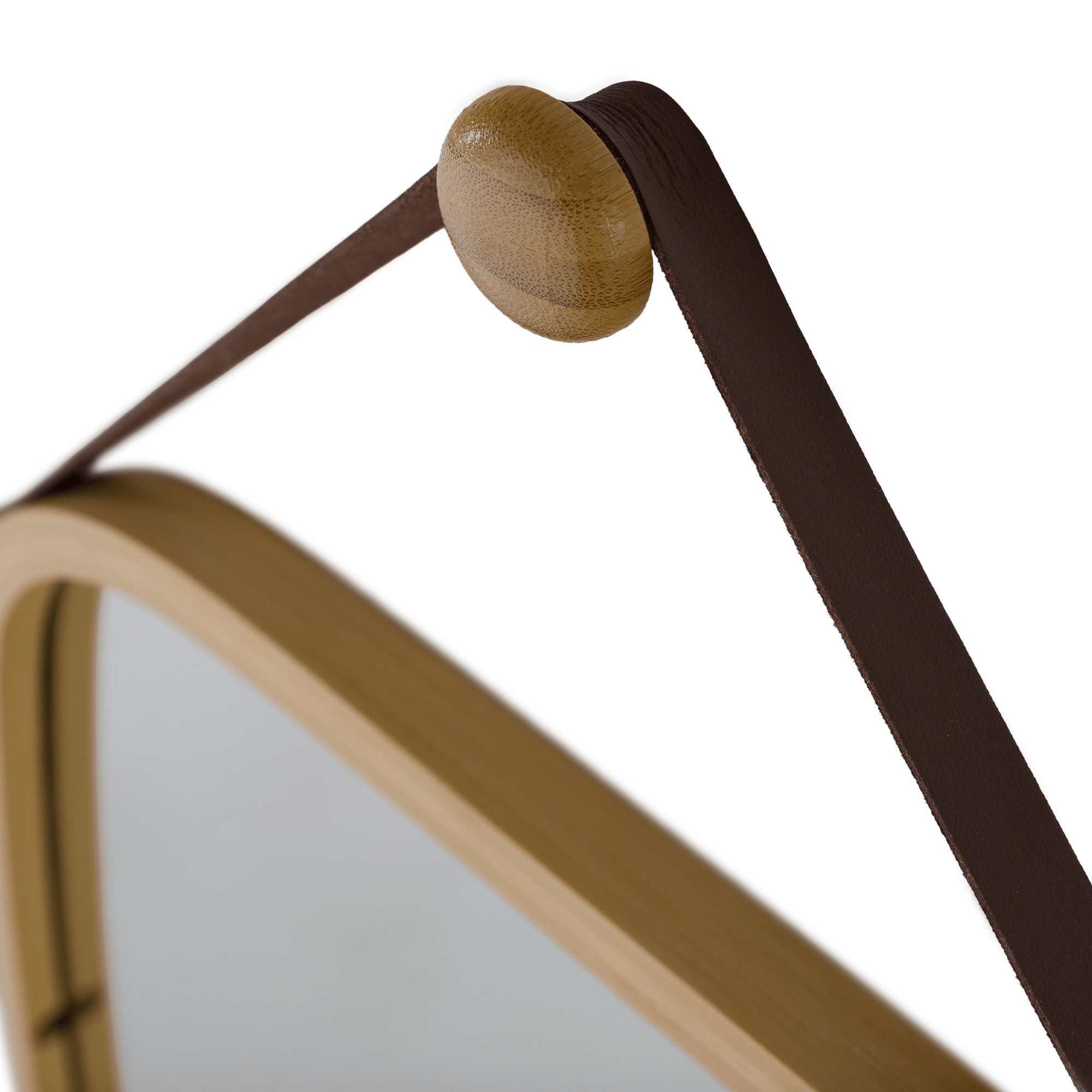 Jednoduché zrcadlo s bambusovým rámem LEMI 3 Materiál: lakovaný bambus / sklo Barva: přírodní Rozměry zrcadla (ŠxHxV): 43x1,5x76 cm Tloušťka skla: 3 mm Dodávaná s dřevěným háčkem. Zavěšení zrcadla: úchytka z hnědé ekokůže Dodávané v monte.