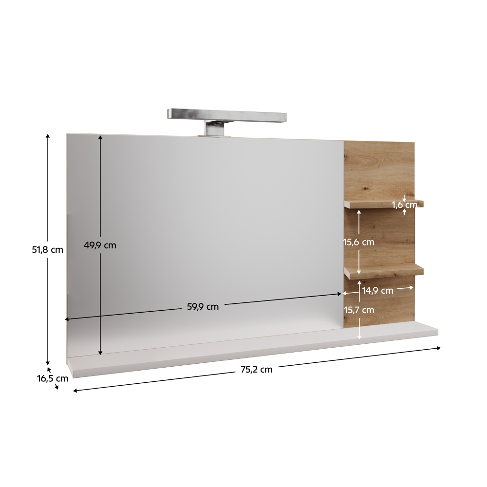 Materiál: DTD laminovaná/sklo Barva: bílá/dub artisan Rozměry (ŠxHxV): 75,2x16,5x51,8 cm Rozměry zrcadla (ŠxV): 59,9x49,9 cm Tloušťka materiálu: 1,6 cm Otevřený úložný prostor S policemi Šířka police: 14,9 cm Nosnost police: 5 kg S LED osvětlením Barva LED osvětlení: studená bílá Doporučujeme připevnit ke zdi Moderní design Dodáváno v demontu